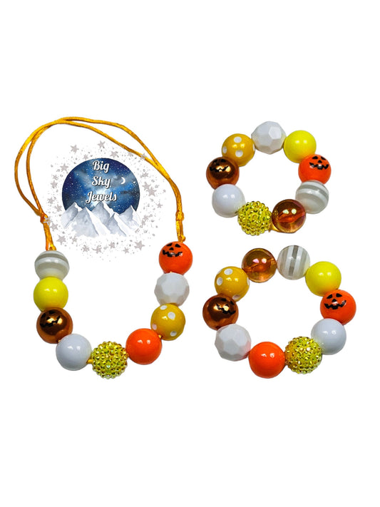 Candy Corn Jackolantern Chunky Bubblegum Necklace OR Bracelet Orange, Yellow, & White Ages 3+ Halloween Multiple Variation Listing