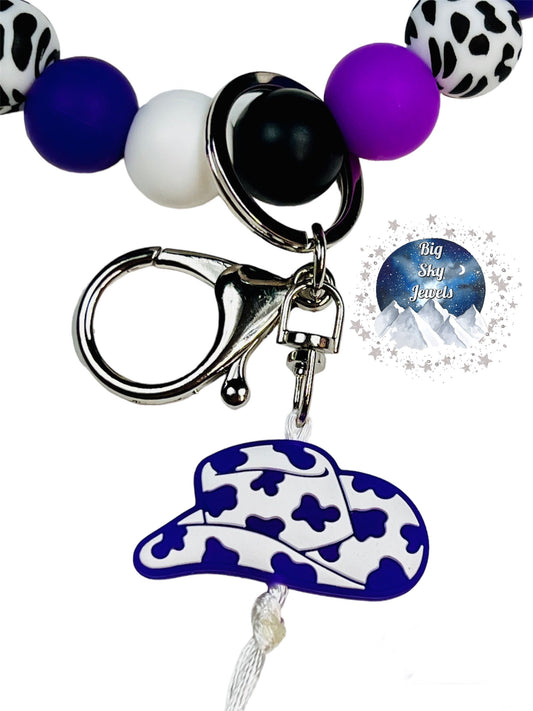 Purple Cowboy Hat Wristlet Keychain Silicone White W/ Black Cow Print Silicone Cow Print Beads, Black, Purple, Deep Purple and White. Ages 8+ Kids or Ladies, Me, Moms Western West