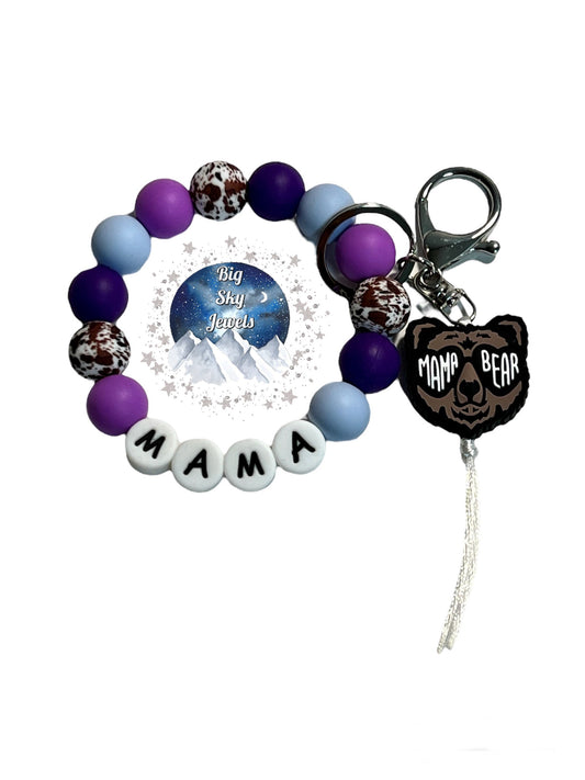 Mama Bear Wristlet Silicone Keychain Custom Order Purple, Brown Cow, & Blue Ages 8+ Kids or Ladies Moms West Western