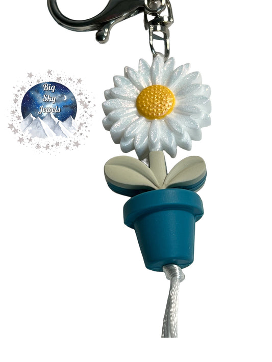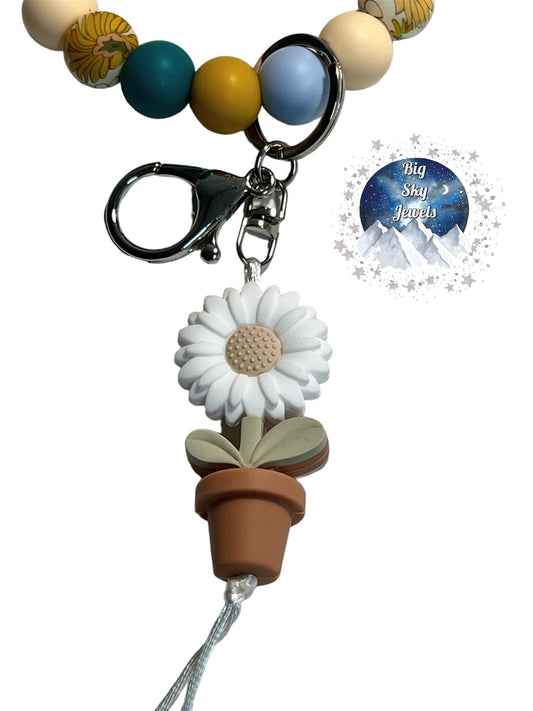 White Boho Flower Silicone Wristlet Keychain Floral Print, Teal, Beige, Cornflower Blue, and Sunflower Yellow. Ages 8+ Kids or Ladies Moms Mothers Day